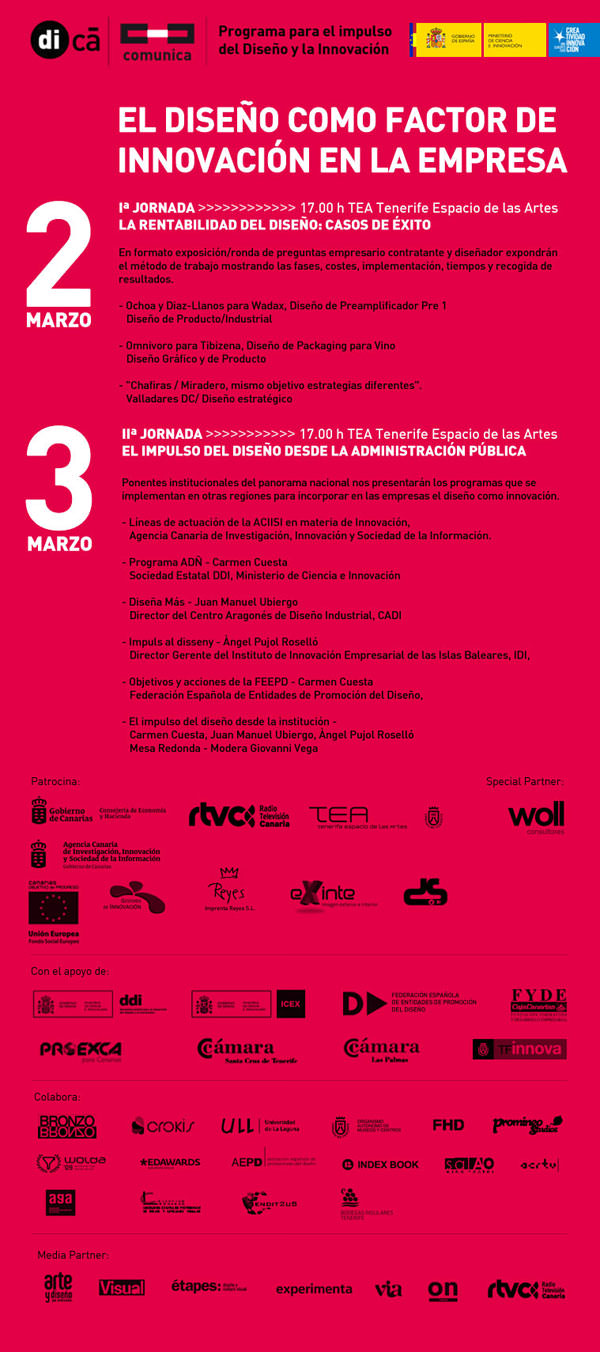 Los próximos 2 y 3 de marzo de 2010 tendrán lugar en el TEA las primeras jornadas que Di-Ca organiza. Dirigidas a todo tipo de público vinculado al diseño en las islas, se presentan como una importante cita para conocer las ventajas del diseño para la innovación y demostrar la rentabilidad de un diseño bien hecho y ejecutado.