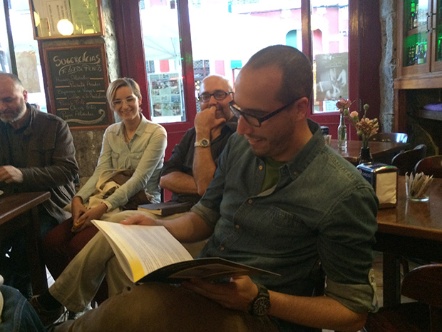 Foto sacada a traición por Sebas, mientras destapan el roll-up de la entrevista.