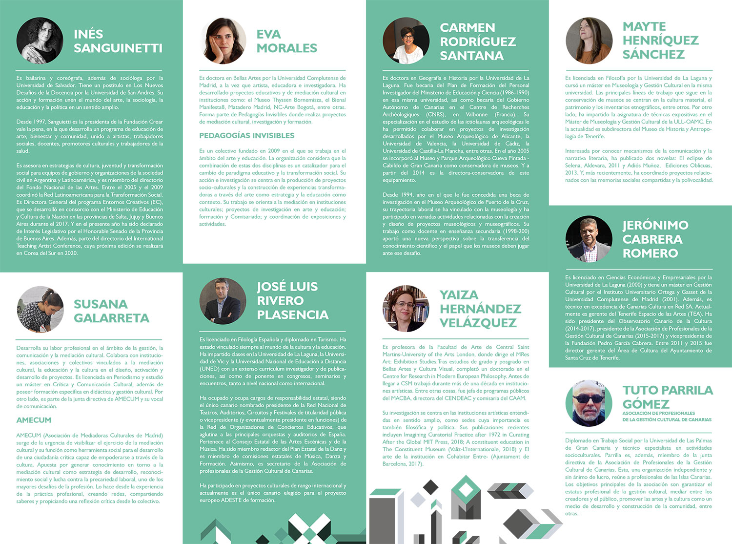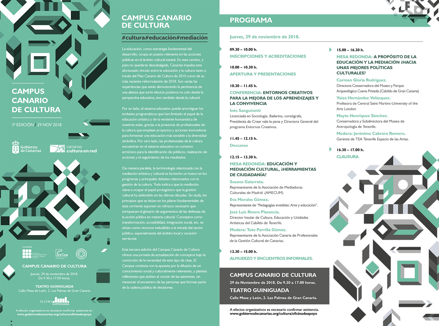 Tras su intervención en este gran encuentro sobre gestión cultural se celebrarán dos mesas de debate. La primera se centrará en 'Educación y Mediación Cultural, ¿herramientas de ciudadanía', que contará con la participación de Susana Galarreta, de la Asociación de Mediadoras Culturales de Madrid y de Eva Morales, de 'Pedagogías invisibles: Arte y Educación'. A ellas se unirá también José Luis Rivero, director insular de Cultura del Cabildo de Tenerife, así como Tuto Parrilla, de la Asociación Canaria de Profesionales de la Gestión Cultural, que actuará de moderador.