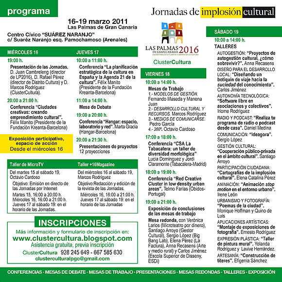 LaBOHEMIA, Red Espacio Guía y Canarias Arte siguieron encontrándose después de ese día para pensar en esas jornadas y crearon Clustercultura, una unidad dentro de la colectividad. La oficina de la candidatura a capitalidad europea de Las Palmas de Gran Canaria 2016, así como la Concejalía de Participación Ciudadana, apoyan desde el primer momento esta iniciativa y empieza un trabajo en el que desde el primer momento la participación, la proposición, el proceso son partes muy importantes. Las Palmas de Gran Canaria 2016 abandera este trabajo de colectivos culturales, como una de las prioridades en su idea de capital cultural, y para ello ha puesto todos los medios y ganas que tienen a su disposición para llevar estas jornadas adelante. Conferenciantes de gran nivel han sido invitados por LPGC2016 y trabajarán codo a codo en las mesas de trabajo para fortalecer la estructura cultural de la ciudad.