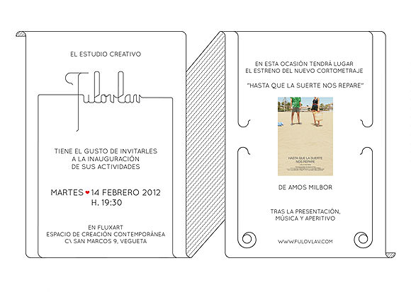 El estudio creativo Fulovlav inaugura sus actividades en la noche de los enamorados. A las 19:30, en el espacio de la asociación Fluxart (calle San Marcos 9), tendrá lugar una charla con aperitivo y disfrute de la proyección de un nuevo cortometraje de Amos Milbor "Hasta que la suerte nos repare".