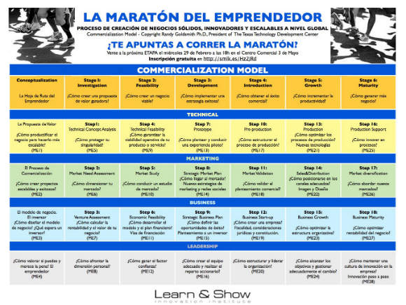 La ‘Maratón del emprendedor’ proseguirá en los próximos meses a razón de una sesión semanal hasta completar las 24 conferencias previstas en el programa, todas ellas enfocadas a la creación y desarrollo de negocios innovadores. Esta serie de charlas basa sus contenidos en un proceso de creación de negocios sólidos, innovadores y escalables a nivel global concebido por Randy Goldsmith, director de The Texas Technology Development Center. No es necesario haber participado en las sesiones anteriores para poder asistir.