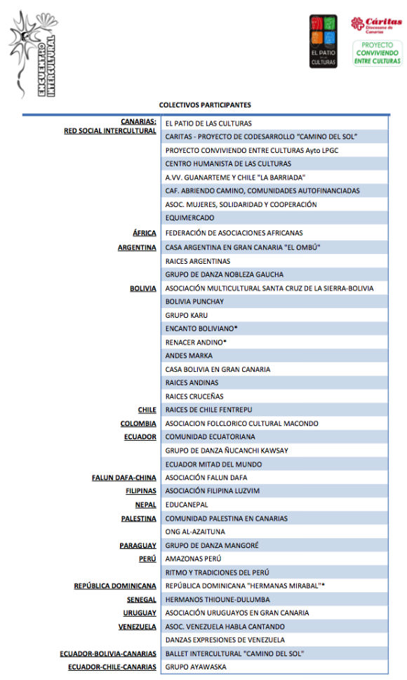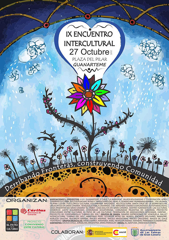 El Patio de las Culturas con la colaboración del proyecto “Camino del Sol” de Cáritas Diocesana Canarias y el programa “Conviviendo entre culturas” del Ayuntamiento de Las Palmas de Gran Canaria han presentado la novena edición del Encuentro Intercultural “Derribando fronteras, construyendo comunidad” que se llevará a cabo el próximo 27 de Octubre en la Plaza del Pilar de Guanarteme en el que participan más de 15 nacionalidades aportando su música, danza, gastronomía y artesanía .