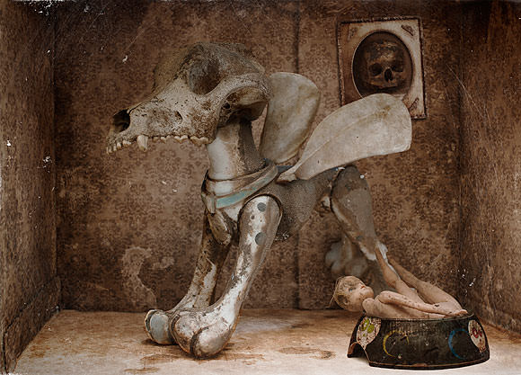 La muerte siempre ha sido, y será, una de las partes más importantes de la cultura del ser humano, en cualquier parte del mundo. Piensa que las 3 religiones más poderosas (Cristianismo, Islamismo y Judaísmo) controlan el mundo, lo dividen y lo hunden con guerras y desgracias de todo tipo. Todas se basan en el miedo a la muerte para controlarnos, por lo tanto la muerte es y será nuestra parte más oscura e incomprendida y sobre todo un proceso doloroso, así que el color negro y las tonalidades oscuras (aunque no en todas las culturas sean así) es para mí el color IDEAL para representarlo. Después depende lo que quieras expresar con cada trabajo, por supuesto… hay algo más que muerte y podredumbre en mi trabajo.