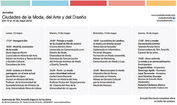 Del 13 al 16 de mayo de 2013 tendrán lugar estas jornadas formativas en el campo de la moda y el diseño. Serán en el TEA, con entrada gratuita hasta completar el aforo en cada sesión.