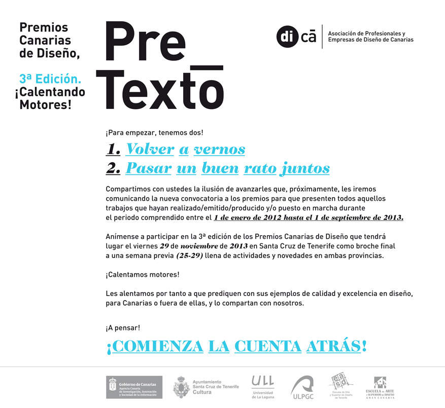 La Asociación de Profesionales y Empresas de Diseño de Canarias (di-Ca), ha comunicado que podrán optar a concurso los trabajos realizados entre el 1 de enero de 2012 y el 01 de septiembre de 2013.