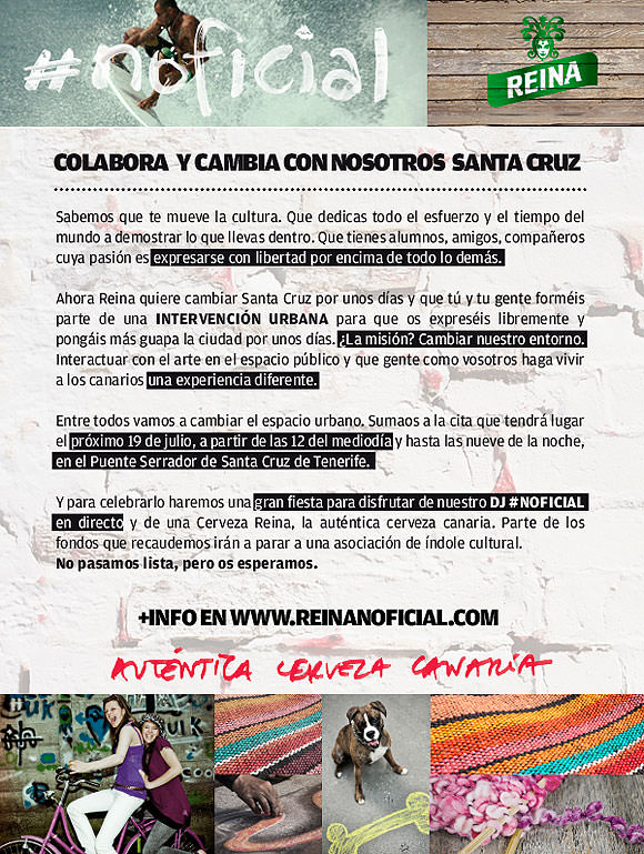 Reina te invita a participar en la intervención urbana de Santa Cruz. Una propuesta creativa en la que los propios ciudadanos y artistas locales transforman, por unos días, un espacio concreto de la ciudad. Pintura, ganchillo, escultura… todos los materiales y técnicas valen para llevar a cabo esta metamorfosis en la que el arte se mimetiza con el mobiliario urbano, dándole un nuevo sentido al espacio público.