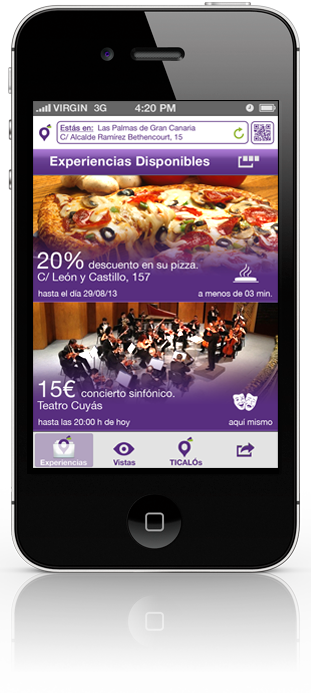 Se trata de la primera app realizada en Canarias que permite al usuario geolocalizar fácilmente las ofertas y experiencias más cercanas. La aplicación permite realizar búsquedas por categorías (restauración, espectáculos, moda, etc) y dispone de un sistema de filtros para que el usuario pueda seleccionar las experiencias que más le interesan en cada momento. La aplicación puede descargarse gratis desde Google Play (para Android) y Apple Store (para iPhone).