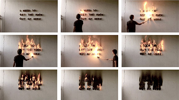 Pablo Requena (Tenerife, 1990) a través de la pintura y la videoperformance repite una y otra vez “I need to get the fuck out of here” (“Necesito largarme de aquí”) y al final acaba quemándolo, como si fuera un ritual pagano que busca implorar a los dioses (o a las instituciones). Por otro lado, Marco Alom (Tenerife, 1986) se sirve de la pintura y el dibujo para recrear escenas convulsas e indóciles llenas de engendros que escupen fuego. Reconocidas plazas madrileñas se ven invadidas por monstruos, ¿se acerca una conquista? Finalmente, Jose J. Torres (Fuerteventura, 1982) utiliza la fotografía como vehículo para mostrar territorios solitarios únicamente asediados por los búnkeres, estructuras que se adentran en la tierra buscando una supuesta protección.