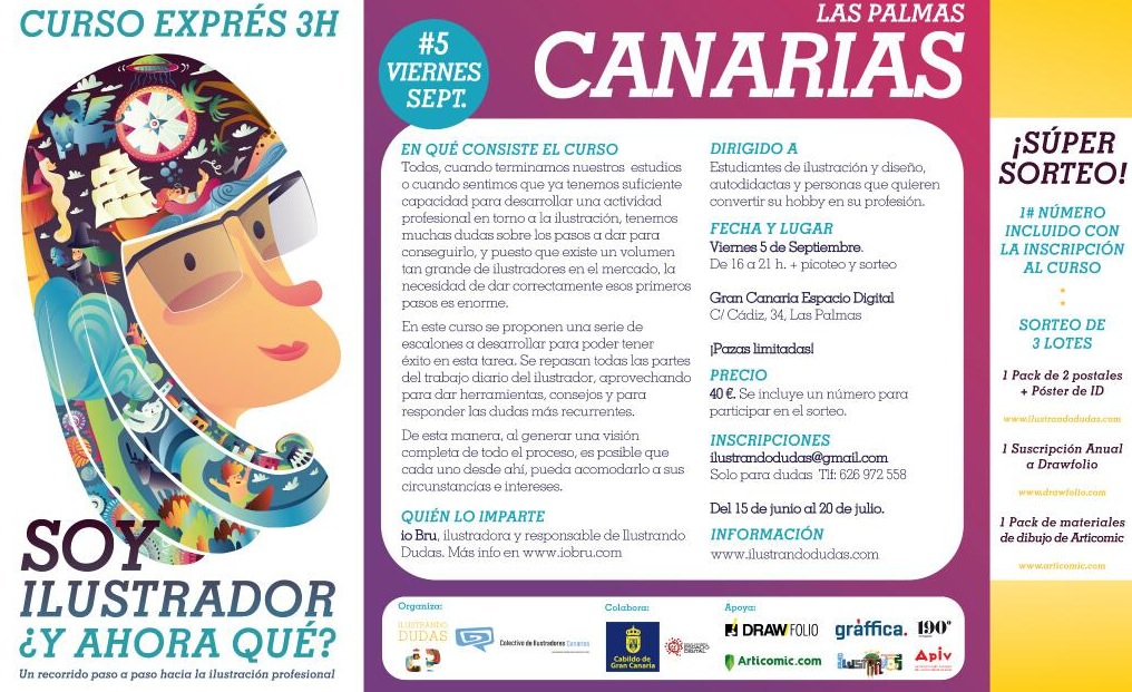 Está dirigido a estudiantes de ilustración y diseño, autodidactas y personas que quieren convertir su hobby em su profesión. Se desarrollará en las instalaciones de Gran Canaria Espacio Digital el viernes 5 de Septiembre de 16 a 21 horas. El coste del curso es de 40€ .
