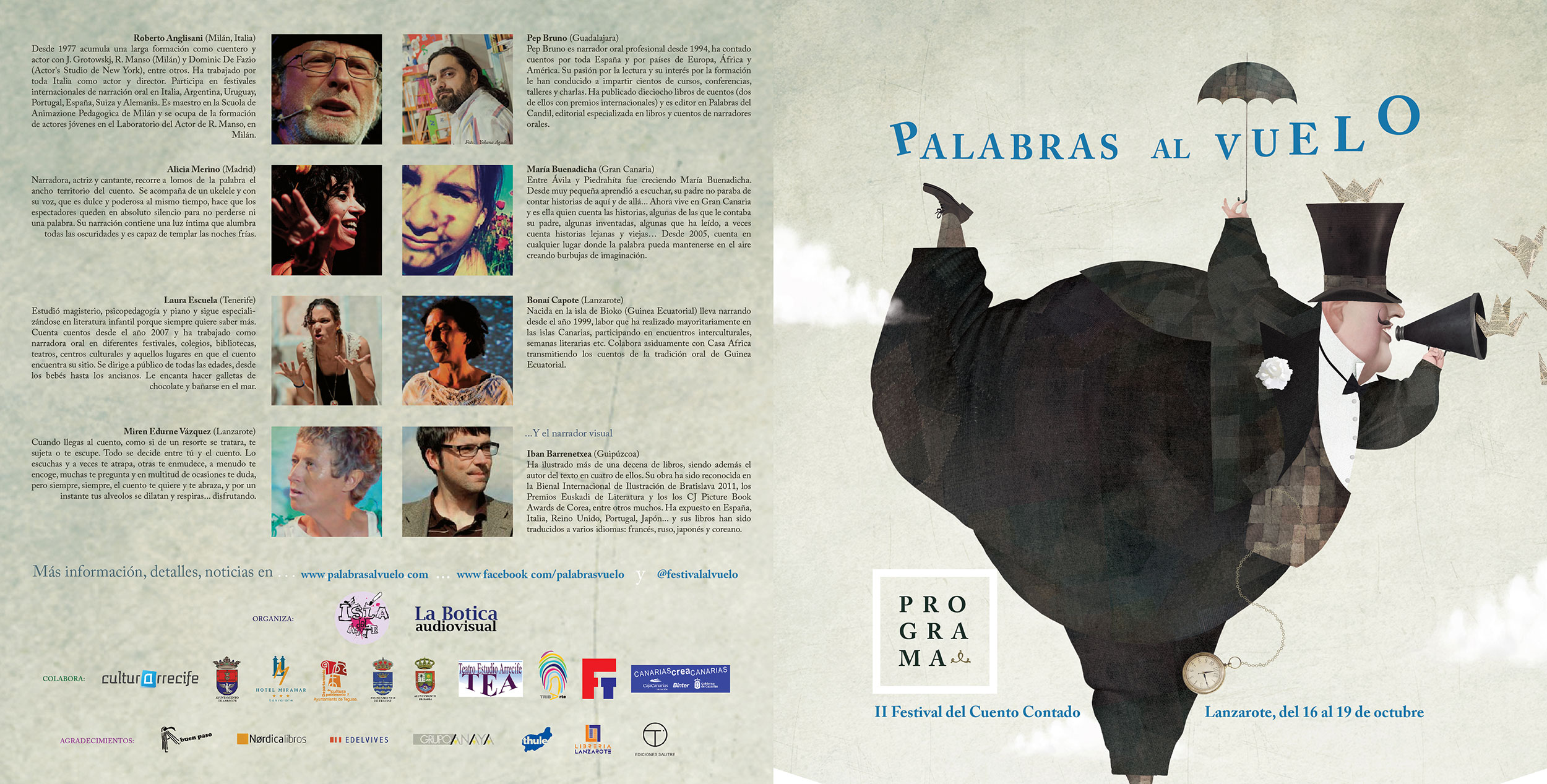 El II Festival del Cuento Contado Palabras al Vuelo 2014 está organizado por la asociación Isla del Arte y la Botica Audiovisual. Cuenta con la colaboración de Cultura Arrecife, Ayuntamiento de Arrecife, el Hotel Miramar -que ofrecerá un 15% de descuento en su alojamiento a los espectadores que asistan al festival-, Cultura Teguise, Ayuntamiento de Teguise, Ayuntamiento de Haría, Teatro Escuela de Arrecife (TEA), Tribarte, Ferretería Tías y Canarias Crea Canarias. La programación de 2014 hubiese sido imposible sin la colaboración de las editoriales A buen paso, Thule, Nórdica Libros, Edelvives, Anaya y Ediciones Salitre, y Librería Lanzarote.