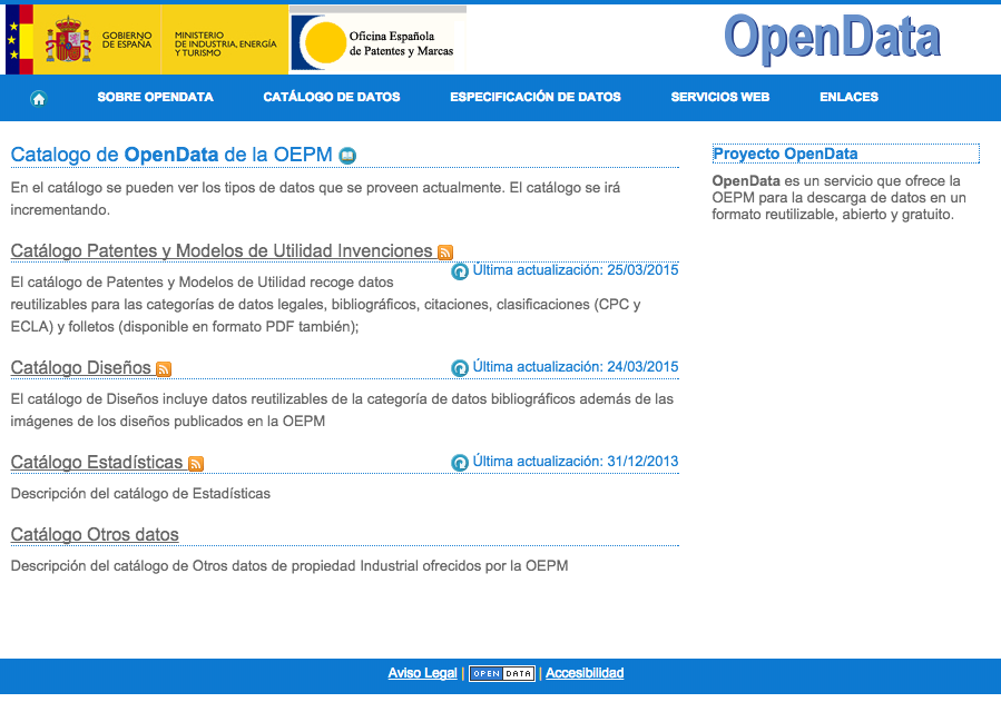 La Oficina Española de Patentes y Marcas en su política de facilitar al ciudadano la reutilización de la información pública por medios electrónicos, dispone de un servicio gratuito que permite el acceso a datos públicos en la Sede Electrónica, Open Data.